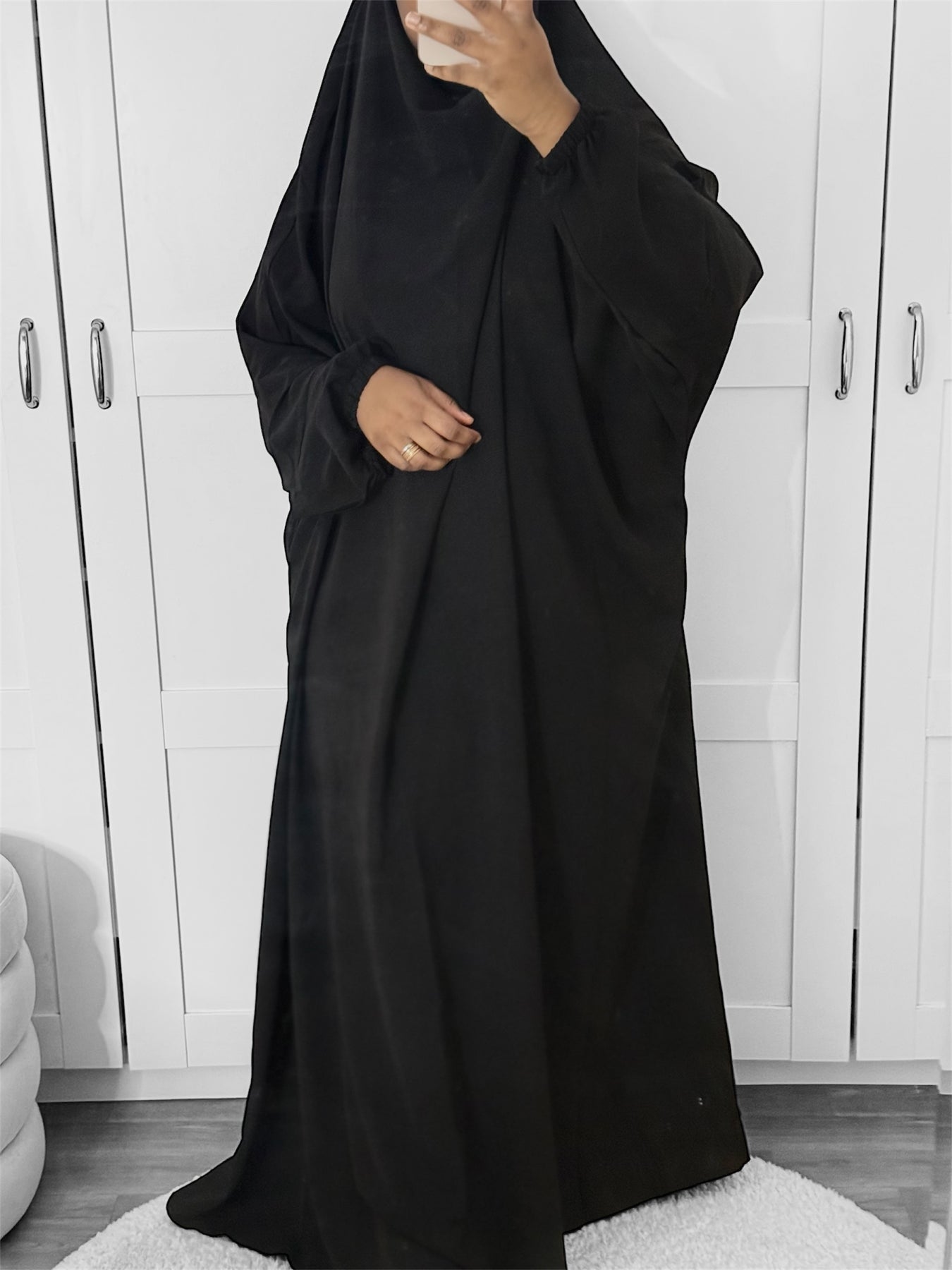 Jilbab 1 pièce en soie de Médine, tissu fluide et aérien vous permet une totale liberté de mouvement pour vaquer à vos occupations quotidiennes. Les poignets sont élastiques pour un meilleur maintien et un confort optimal.