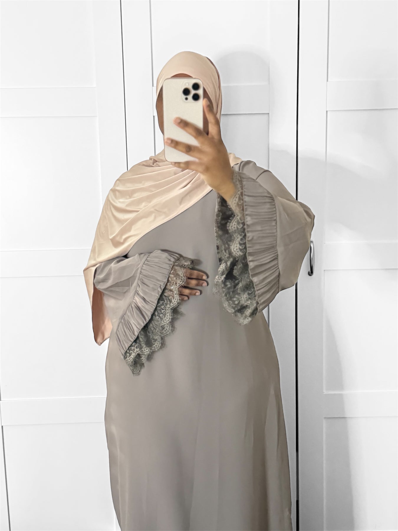 Cette abaya en soie de Médine avec manches dentelle est un incontournable pour celles qui recherchent une tenue modeste, élégante et confortable, facile à porter chaque jour tout en restant raffinée.