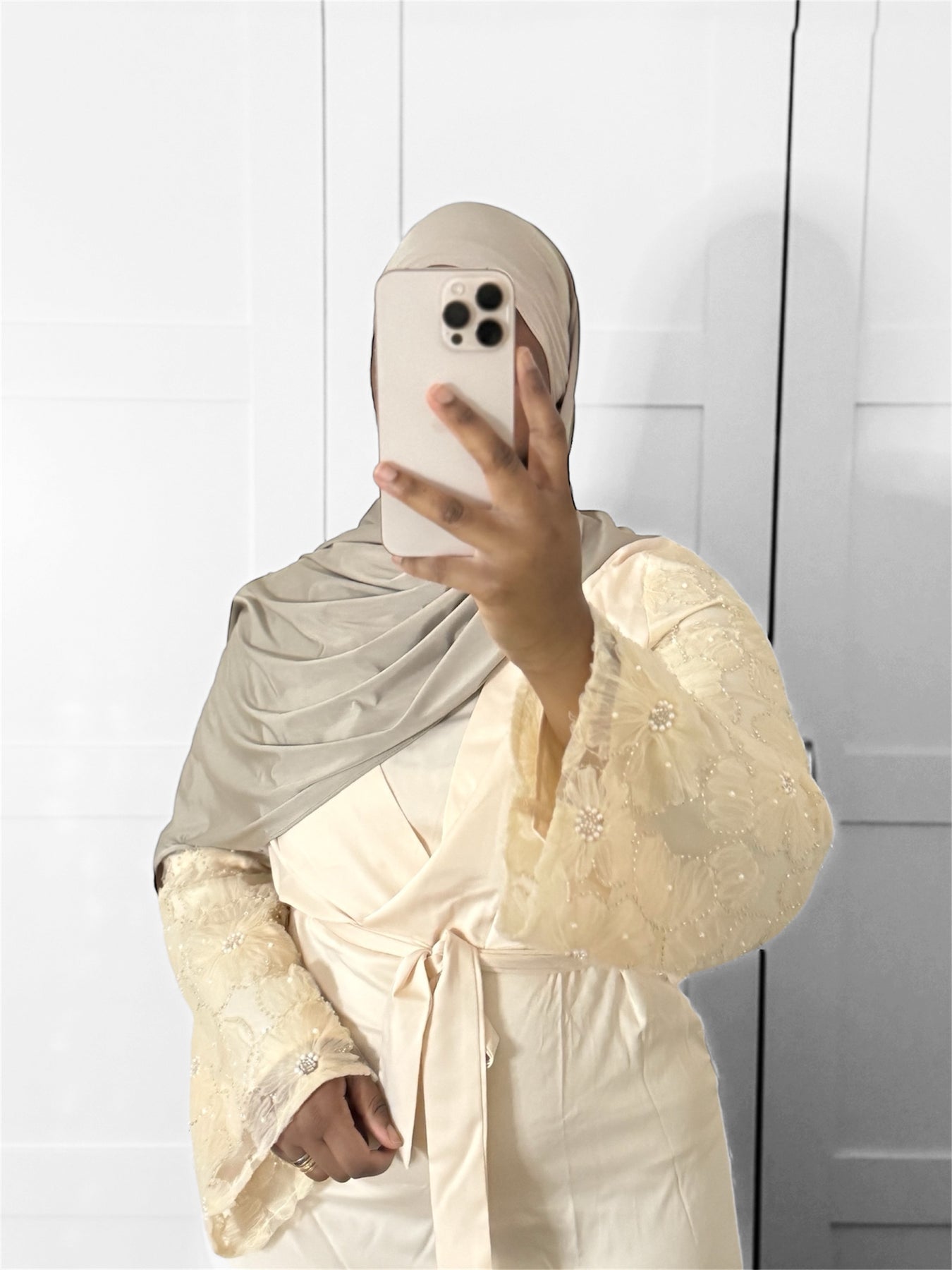 Robe pour l’Aid manches brodées est une pièce élégante et raffinée qui se distingue par ses détails délicats et son tombé fluide. Confectionnée dans une soie de Médine douce et opaque, elle offre un rendu chic tout en restant confortable à porter au quotidien.