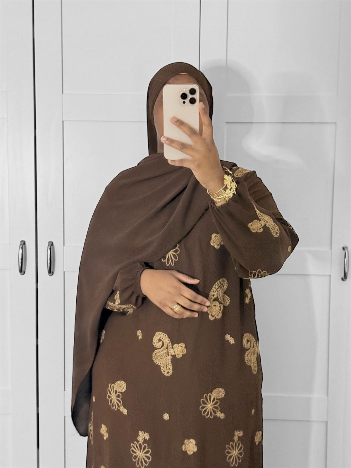 Succombe à l’élégance intemporelle de cet ensemble raffiné composé d’une abaya longue fluide et de son hijab assorti en jazz. Une tenue idéale pour le Ramadan, l’Aïd ou toute occasion spéciale où tu veux être élégante tout en restant pudique.