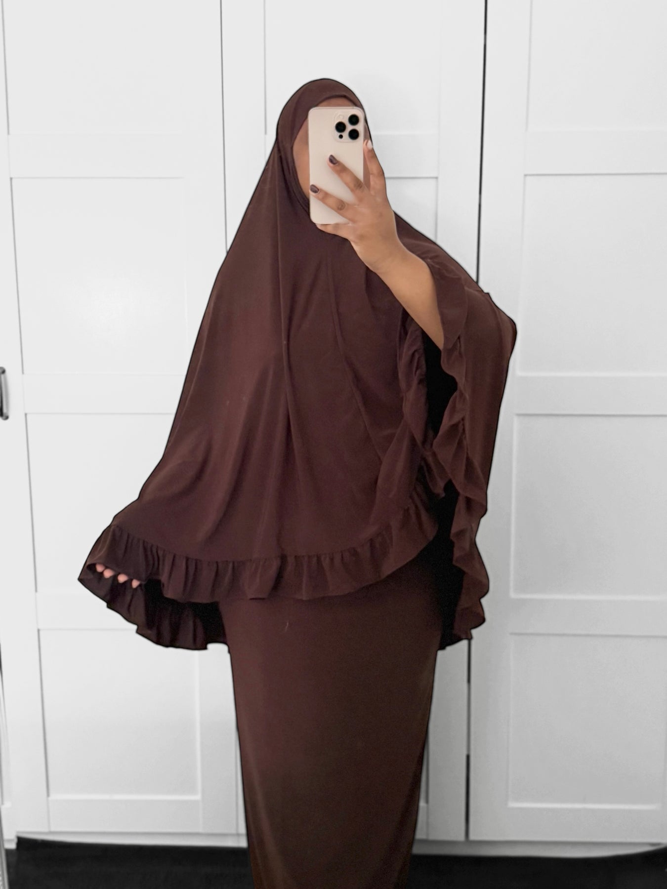 Ensemble de prière froufrou pas cher composé d’un long voile à froufrou et d’une longue jupe.